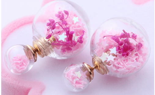 Le misure sono standard, però sono fatte in vetro e bigiotteria, all’interno delle sfere ci sono delle stelline in plastica che io ho scelto color rosa e un rametto di fiori color fucsia.